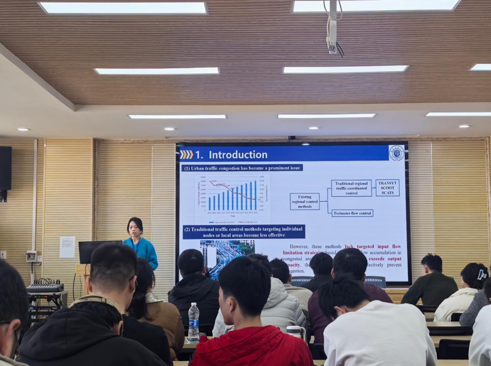 在互动环节,与会师生围绕MFD仿真建模的准确性、扩展卡尔曼滤波(EKF)在实际应用中的挑战、不同区域划分与边界控制策略对路网性能的影响等话题,与卢霄娟博士展开了热烈而深入的交流。讨论内容涵盖了从理论模型到工程实现的多个方面,现场学术氛围浓厚。本次讲座整场报告内容深入系统、逻辑清晰,为与会者提供了基于宏观基本图(MFD)的交通系统仿真优化研究的前沿视角与方法论指导,反响热烈。