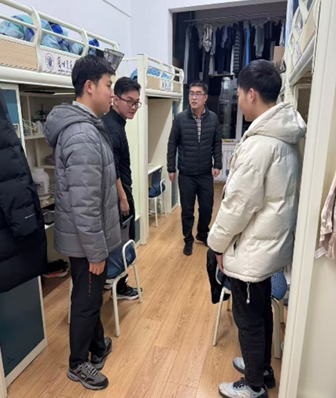 在2025级研究生宿舍走访中,班主任老师们分别走访了男女生宿舍,在了解宿舍用电和消防安全情况的基础上,结合季节变化,提醒同学们注意防寒保暖、合理作息,并鼓励研一学生加强体育锻炼,尽快适应研究生阶段的学习与生活。