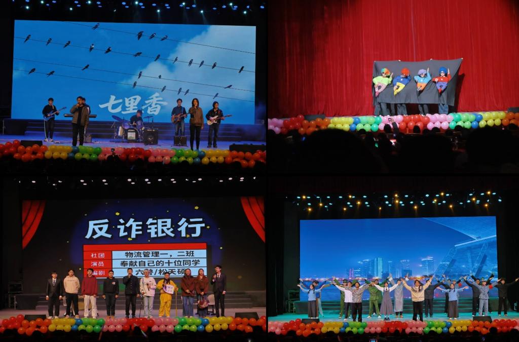 晚会第一篇章以“青春逐梦 薪火启毓”为主题,爱乐乐团带来的《七里香》乐队表演节奏明快,迅速活跃现场氛围;交通运输2505班的手偶表演《牛仔很忙》创意十足、憨态可掬;交通工程2502、2503班带来的《反诈银行》创意诙谐,以趣味形式普及反诈知识。其中,交通工程2502班、交通工程2503班联合呈现的话剧《百年回响・觉醒之路》以五四运动为核心主题,还原青年学子振臂高呼、追求真理的热血场景,再现革命先辈在风雨如晦中勇担救国使命的壮阔历程,经典场景与激昂呐喊直击人心,让新生在沉浸式体验中感悟红色精神。