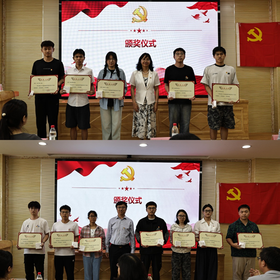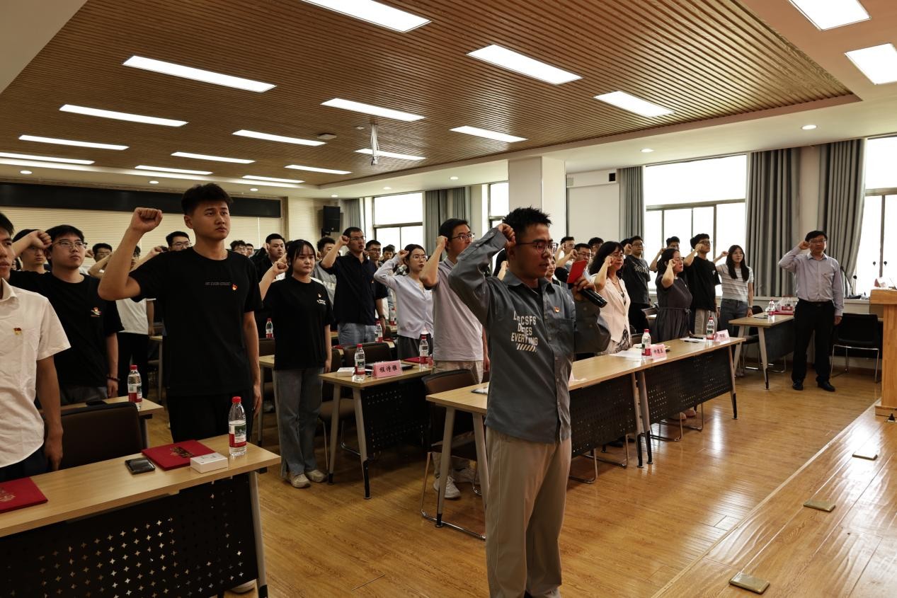 颁奖仪式后,大会举行了新发展党员入党宣誓仪式。学院党委委员和党支部书记代表为新吸收加入中国共产党的预备党员佩戴党徽并赠予《中国共产党章程》。在庄严的党旗下,新党员们起立宣誓,全体党员一同重温入党誓词,铿锵有力的誓言响彻现场,表达了党员们对党的忠诚和为共产主义事业奋斗终生的决心。