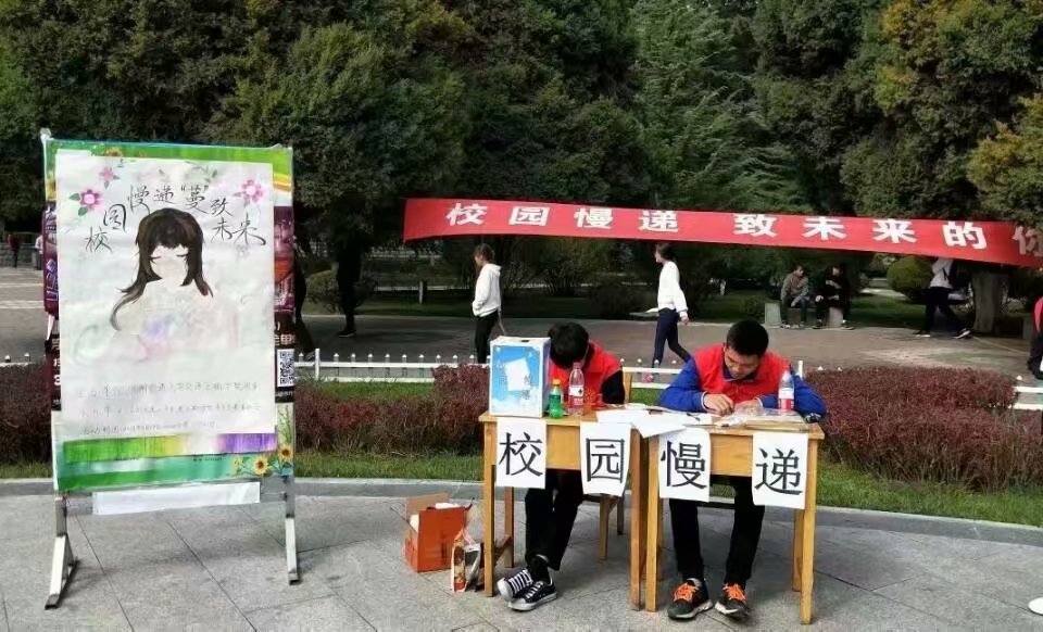 为让全校师生暂时放缓生活的节奏,重新审视时间和梳理未来的人生规划与期望,营造积极向上的高校氛围,2018年10月18日至26日兰州交通大学青年志愿者协会的志愿者们在本校图书馆前成功开展校园慢递活动。