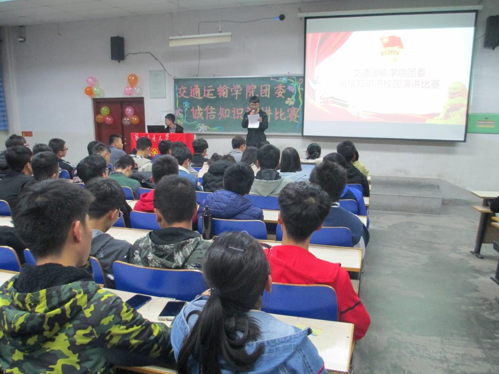 “车无辕而不行,人无信则不立。”为普及信用文化知识,提高风险防范意识,严肃考风、考纪,深化“诚信校园行动”,教育引导青年大学生步入社会后成为拥有更多信用财富、有担当的新青年,积极营造“青年有信用、信用有价值”的良好社会氛围,交通运输学院团委于2018年10月26日19点30分在七教1804教室举办了以“诚信待人、诚信做事、诚信学习、诚信立身”为主题的演讲比赛。