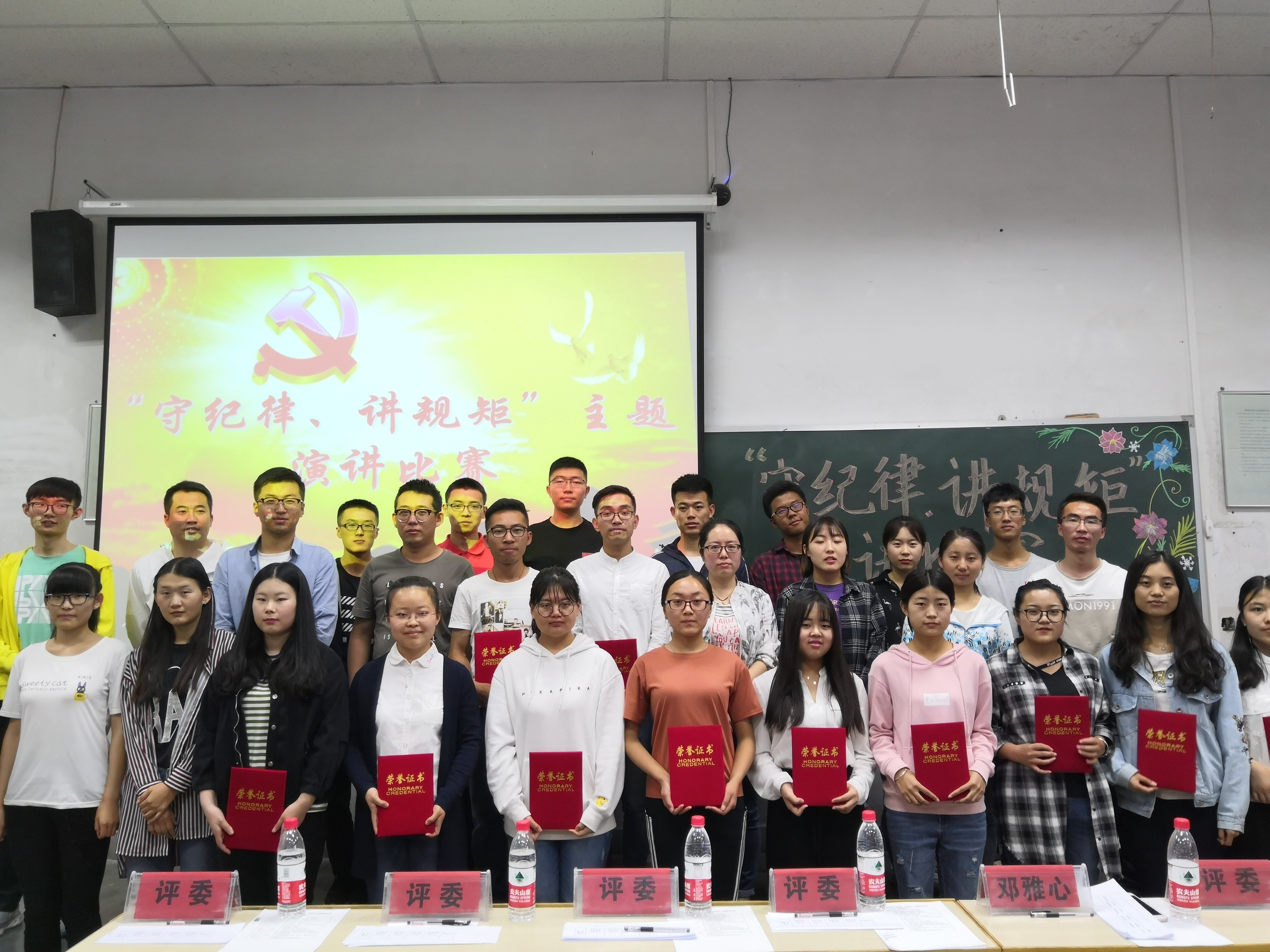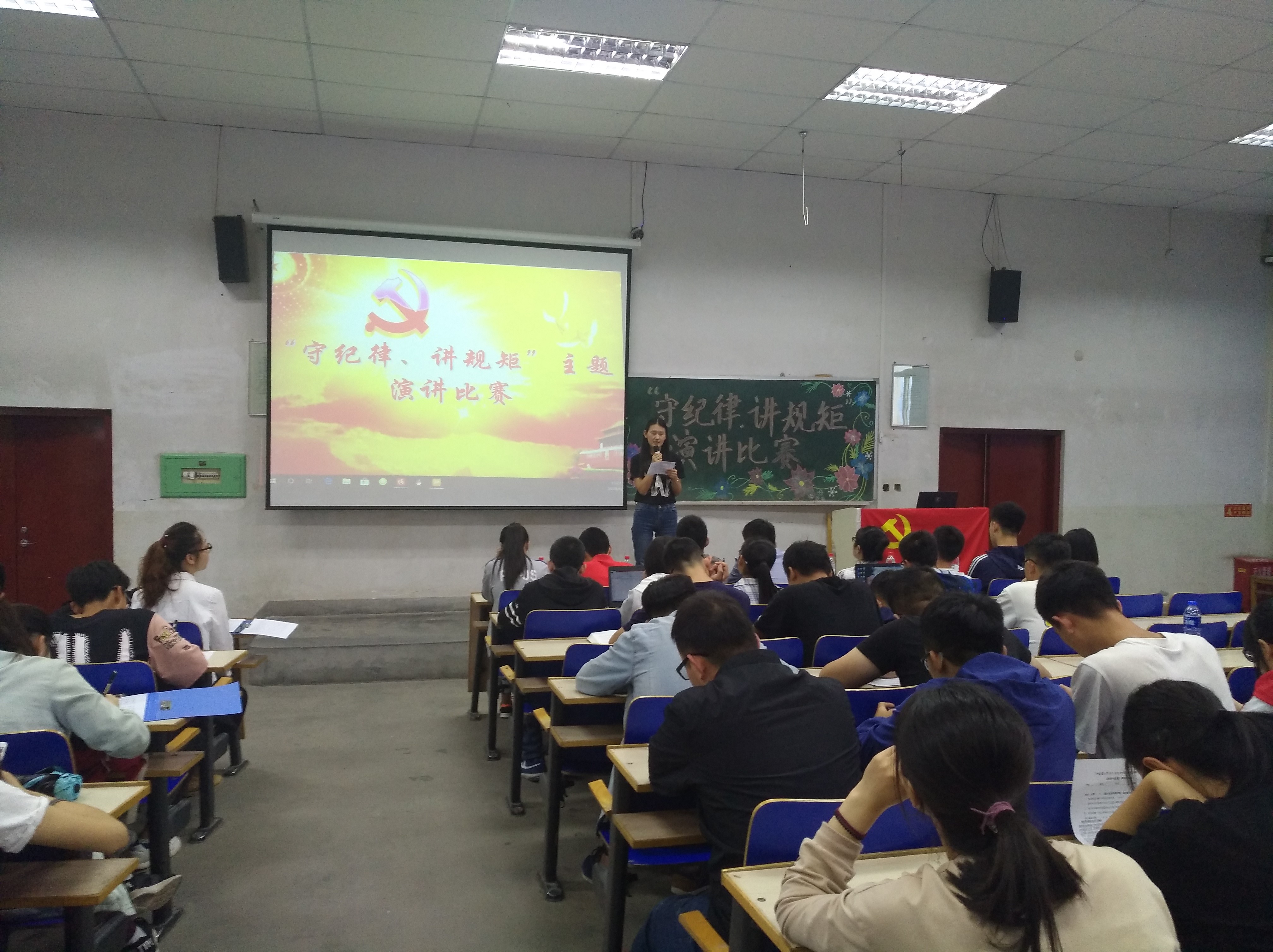 为贯彻落实习近平新时代中国特色社会主义思想和党的十九大精神,深入贯彻落实习近平总书记反复强调:“要加强纪律建设,把守纪律、讲规矩摆在更加重要的位置”,加强各级党组织纪律建设,提高各级党组织和党员干部的思想认识,切实营造广大党员履职尽责当先锋、立足岗位争优秀的浓厚氛围,按照学校党委工作安排,我院于2018年6月7日下午三点在七教1801举办“守纪律、讲规矩”主题演讲比赛。