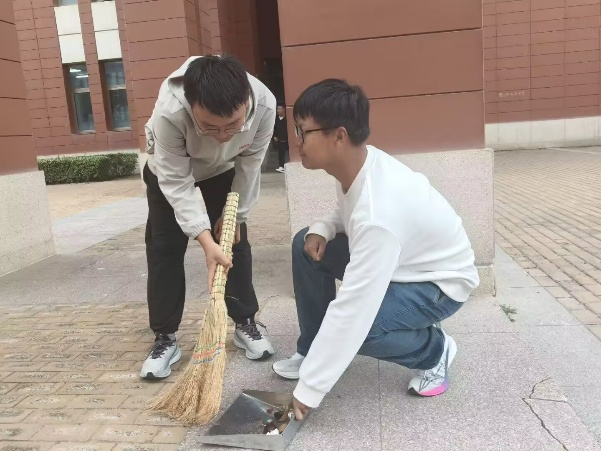 活动中,同学们在指定区域集合后,按预先分组领取清扫工具,有序行动:在九教内,大家细致清扫走廊与楼梯间的积尘,不放过角落缝隙;在和谐园里,众人手持扫帚、垃圾袋,弯腰清理花园内的落叶、纸屑等垃圾,用实际行动践行“奉献、友爱、互助、进步”的志愿精神。