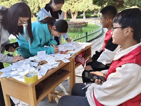 活动前期,校园文化部完成细致筹备:采购星星纸、马克笔,规划流程,在广场布置区域、摆放桌椅与指引标识,还准备了折纸教程手册和成品样品。活动中,志愿者引导参与者在星星纸上写下“祝祖国繁荣昌盛”等祝福,协助大家折纸,折好的星星被寄予了最美好的憧憬。